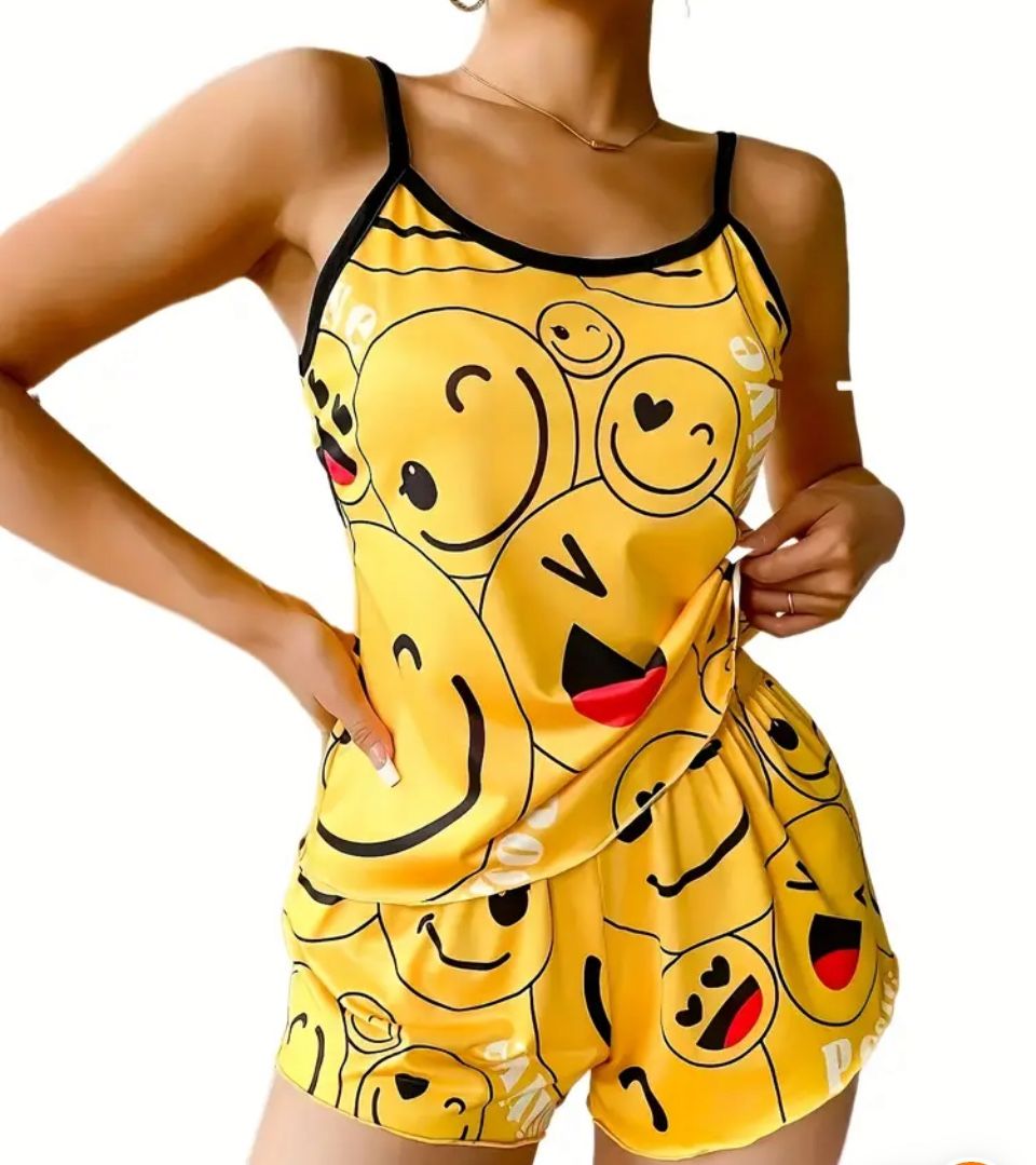 Smile Face Print Paja Set, Cute Round-neck Backless Suspender Top And Elastic Shorts, Women's Pajas. XS, Small, Medium, 2-Large