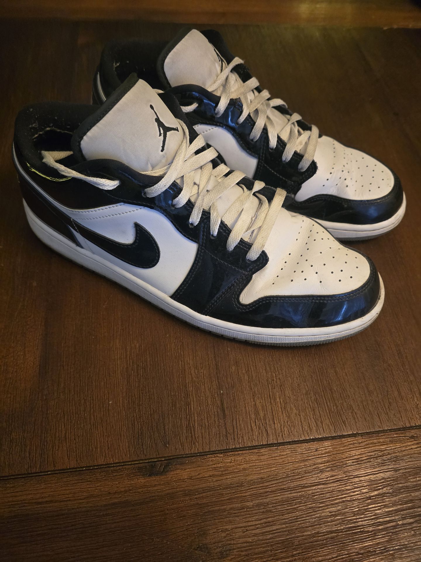 These are Nike Air Jordan 1 Low Concord lifestyle shoes in a black and white colorway featuring patent leather accents.