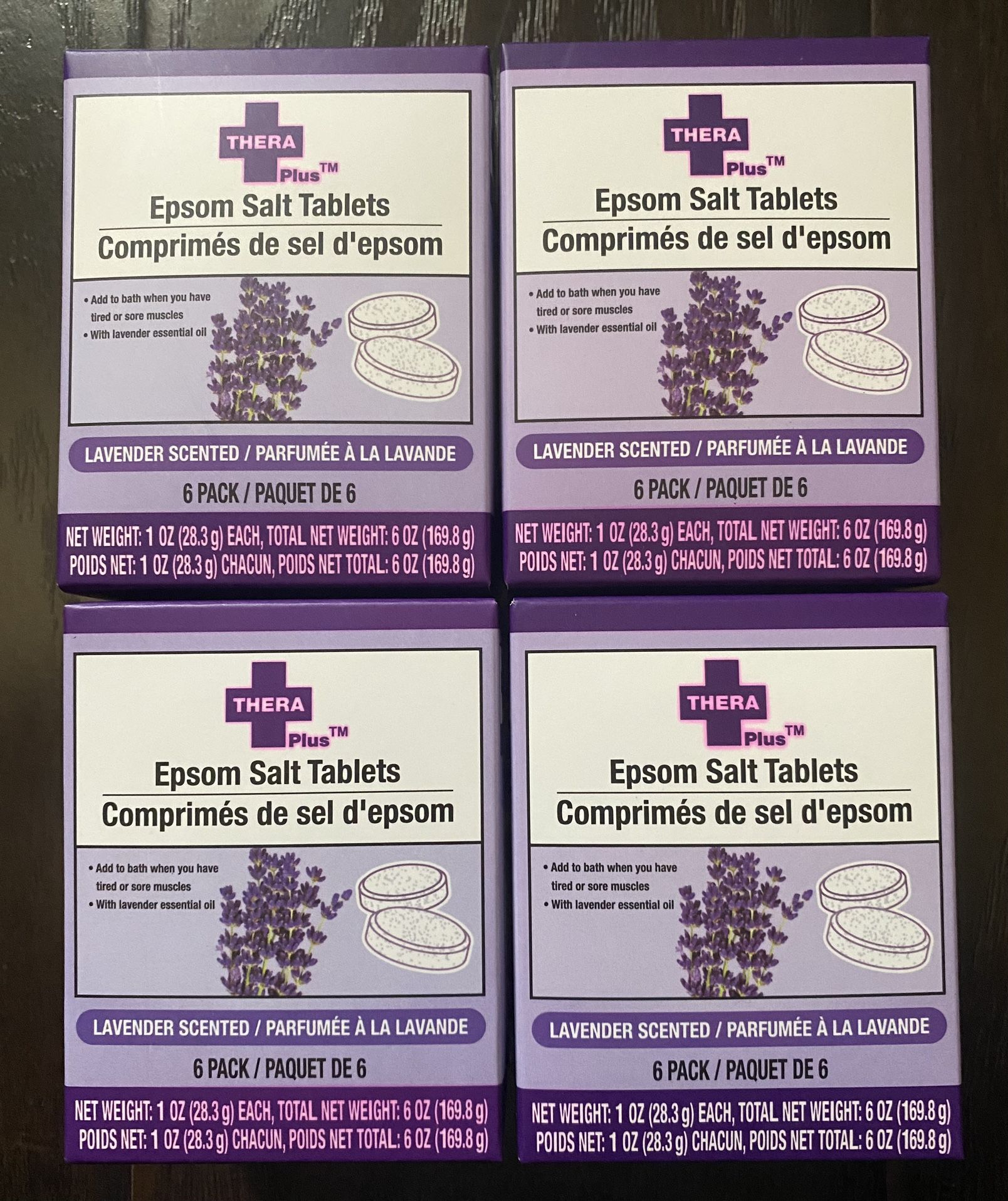 Thera Plus Epsom Salt Tablets Lavender Scented (4 Boxes/24 tablets ) EXP 3/2024 Add to bath when you have tired or sore muscles With lavender essential oil This listing is for 4 boxes. There are 6 tablets in each box. 24 tablets total. I’m going to ship this item within 3 business days.