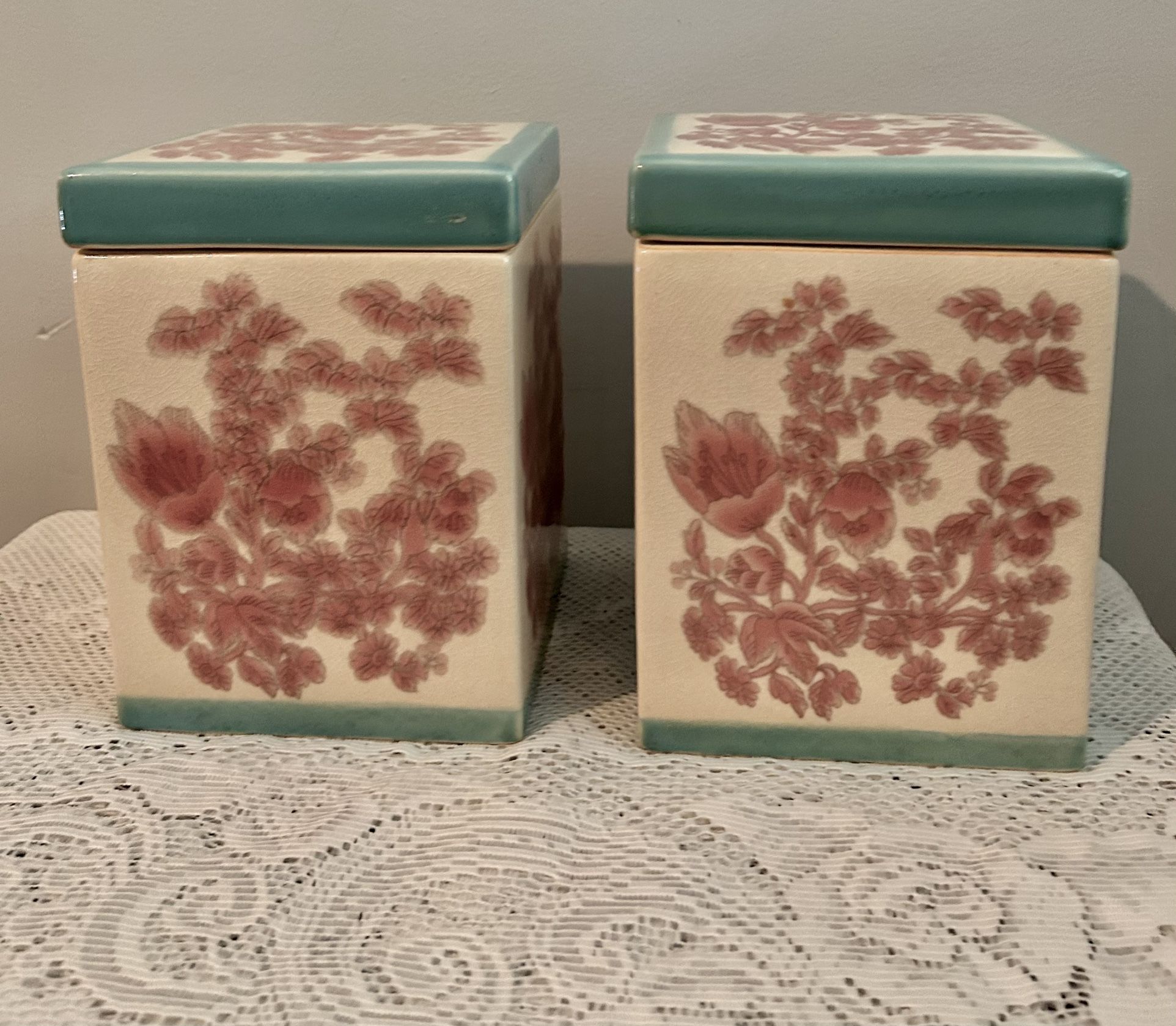 Beautiful pair of vintage Pier 1 square ceramic canisters. Pink floral pattern with blue accents. Each measures approx. 8x 5.75 x 5.75.” Great condition-no chips or cracks!