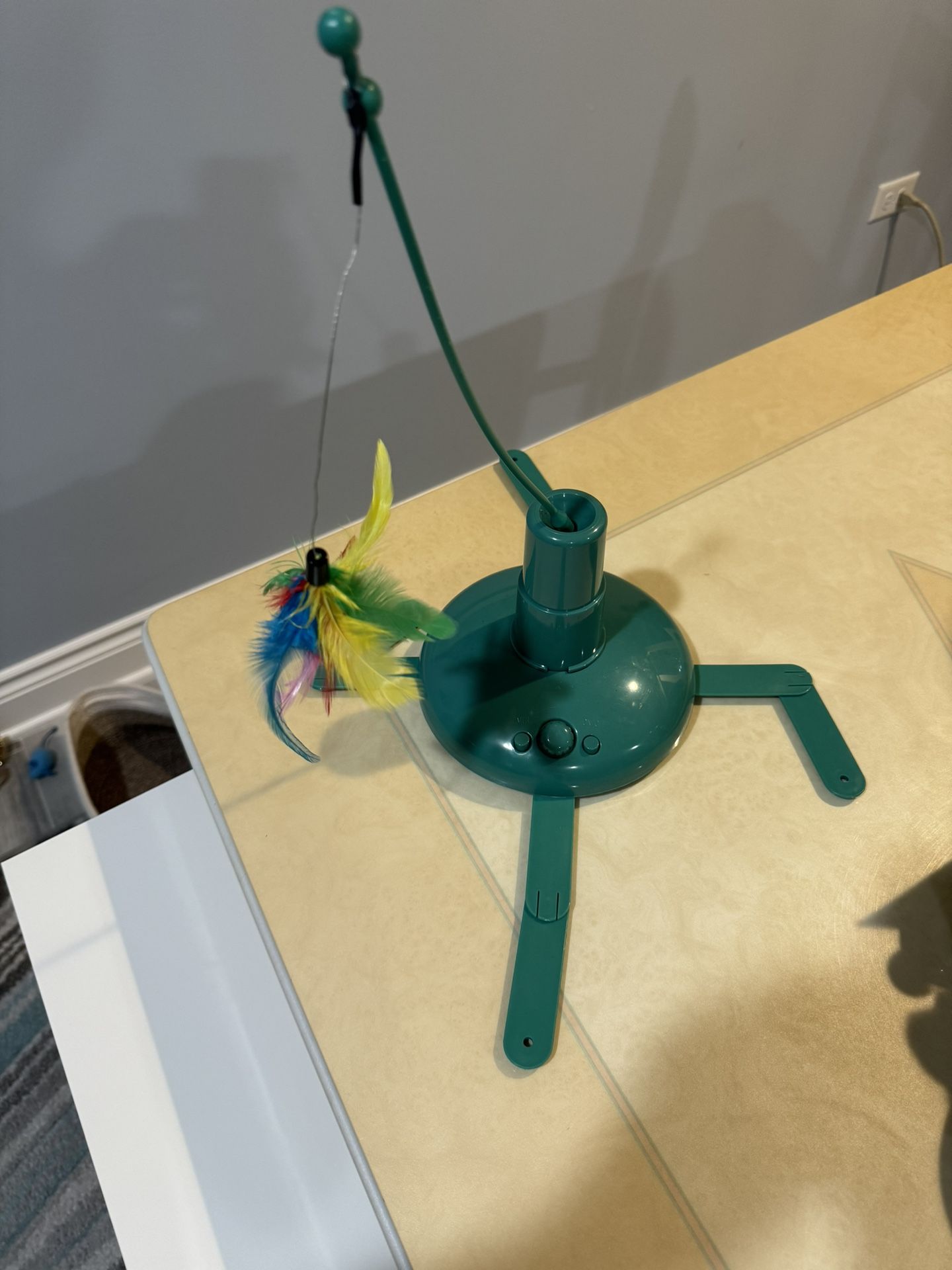 Turn it on and let your cat play for however long! The feather goes around in circles. Very fun. The long sticks are able to be bent in different shapes as shown in the picture