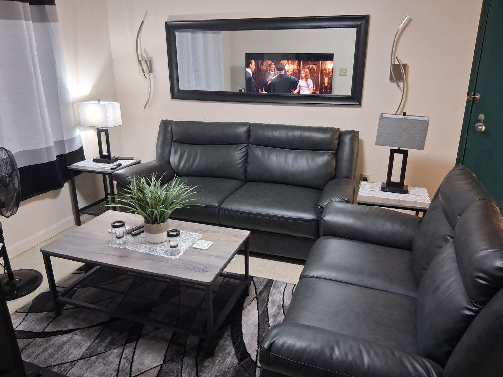 Grey leather couch and love seat , $600 65"vizio tv $225 Tv fire place stand holds up to 70" $225 Large black mirror $40 Batterie operated wall scones $80 50" hisense fire tv $150 Set of Grey and black lamps with built in USB ports $60 All items are less than a month old and the only reason for selling is because im moving out of state.