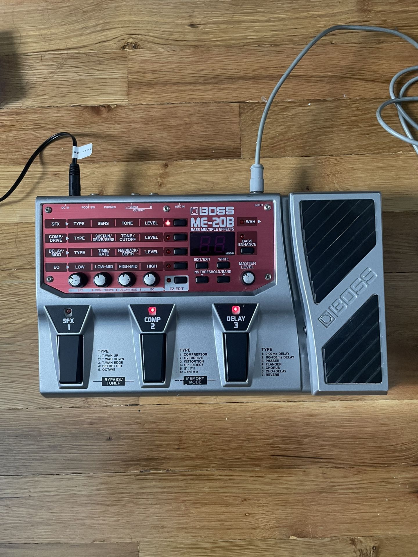 Great condition. The Boss ME20B Bass Multi Bass Effect Pedal is a multi-effects pedal that is designed for live performance and is built to be tough enough to handle the rigors of the road. It has a variety of effects including wah-wah, compressor, overdrive, flanger, distortion, chorus, delay, and reverb. It also has a Bass Enhance function that provides an instant presence boost. Reviewers say that it has good sound quality, is easy to use, and has a deep, rich chorus sound
