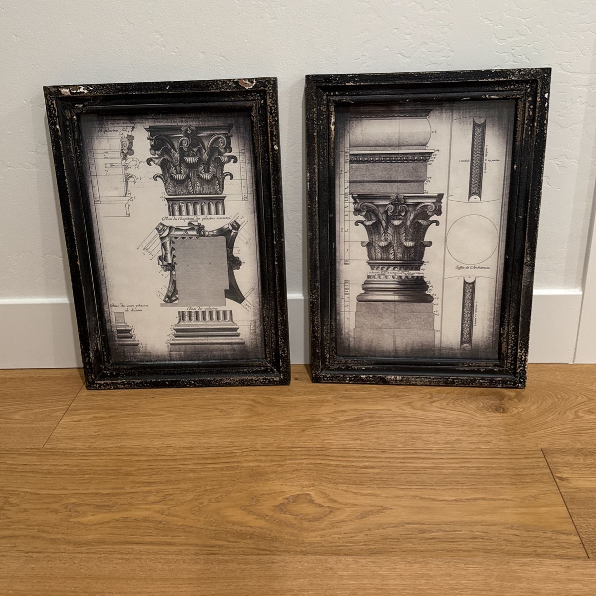 Two hanging framed architectural prints of ancient columns. They measure 21”x14”. In excellent condition Asking $30 for the pair.