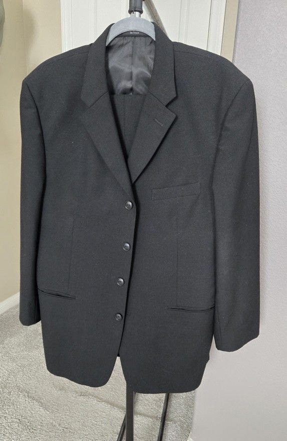 Single-breasted, black, lined wool suit, jacket size 42 Regular, pants size 34x32, cuffed pant leg, great condition.