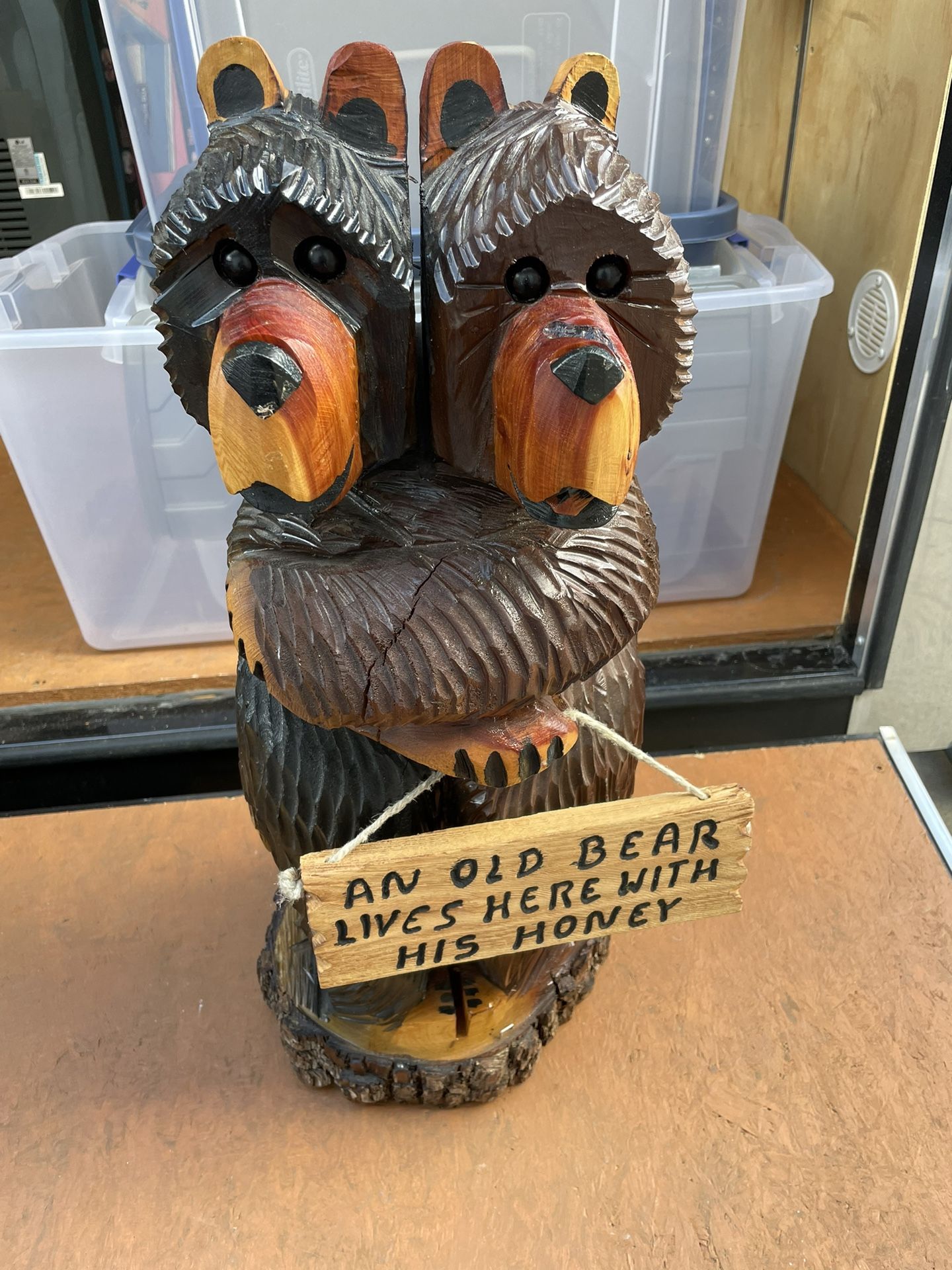 Two wooden bears. Real wood 22 inches tall by 10 inches wide by 11 across. Cash only