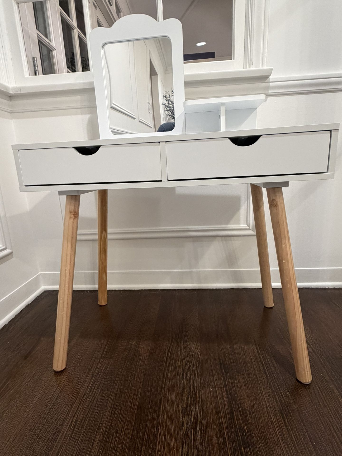 Costzon Kids Vanity Set, Girls Vanity Set with Mirror, 2 Large Drawers, Storage Shelf, Wooden Princess Makeup Dressing Table, Pretend Play Vanity Table and Chair Set for Toddlers, White