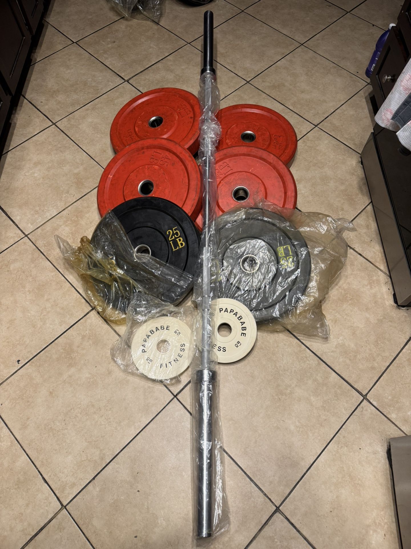 Olympic bumper weights 250lbs total plus 7ft 45lbs bar firm price