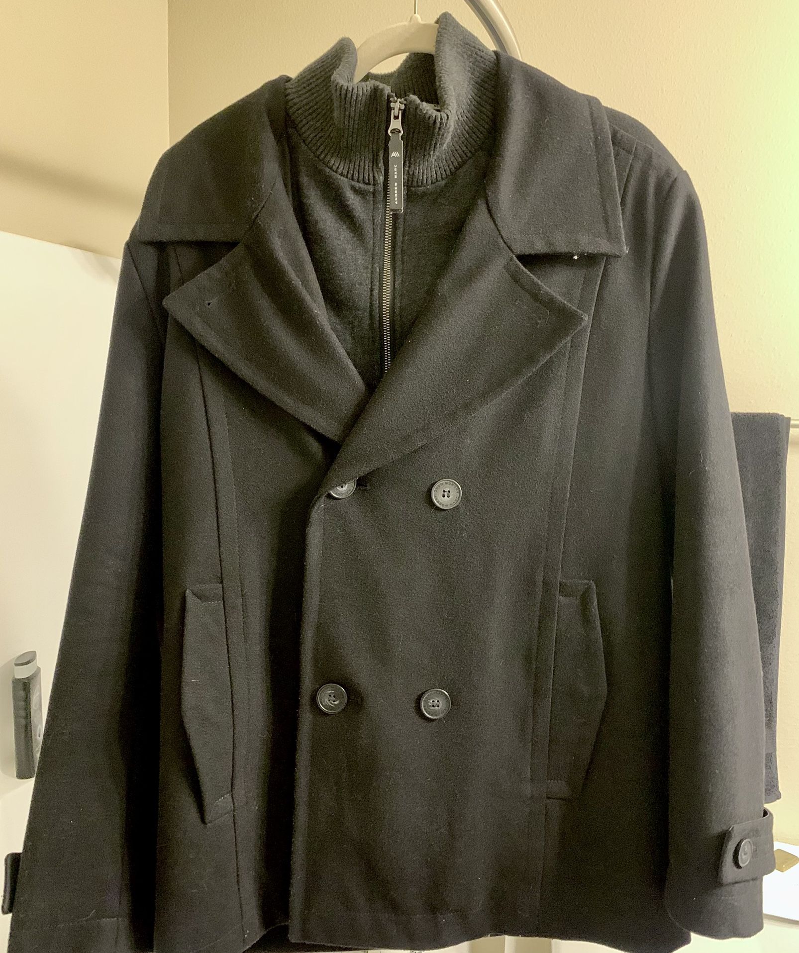 Cold season is coming! Wool pea coat with a grey turtle neck underneath. This will definitely keep you warm and stylish. Price is NEGOTIABLE. Just not a cheap jacket lol. Thanks! Worn a few times.