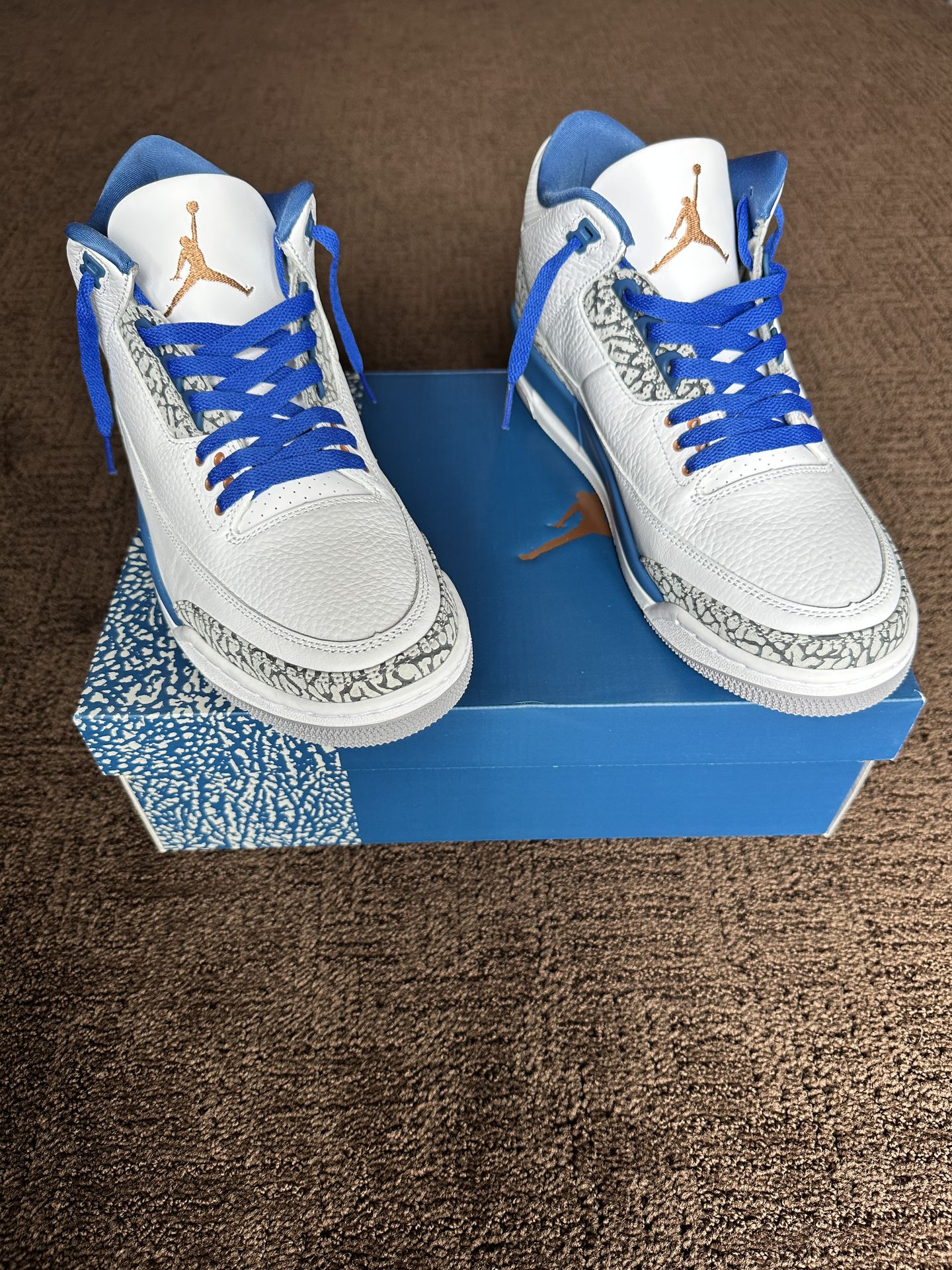 Air Jordan 3 Retro Wizards, White/TrueBlue/CementGrey/MetallicCopper, Style CT8532-148, Release Date 04/29/2023 Brand new, never worn, original box, authentic, receipt available. *Free shoe trees included to help maintain shape and minimize creasing while not being worn* Pickup Location Is North Decatur/215 Costco Parking Lot, No Deliveries, No Trades.