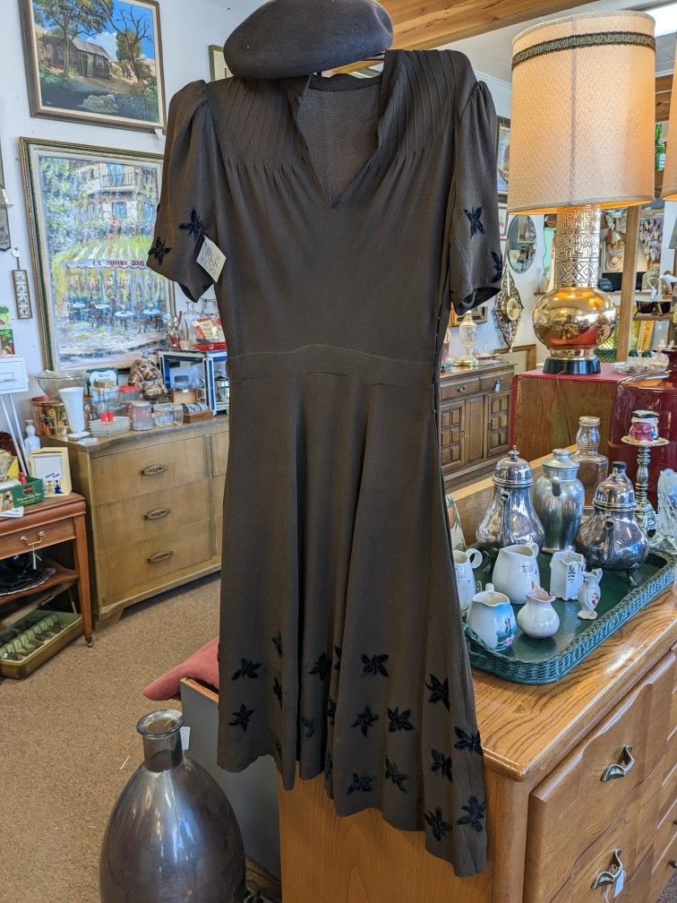 1940s Brown Silk Crepe Dress W Black Velvet Butterflies Sz Small. A few small holes and slight fading. In good vintage wearable condition. Flat lay measurements: 17" pit to pit 13" waist 42" long Ask about shipping Retro Revival 280 N Grant St Canby Or Open 10-6pm Mon-Sat 10-5pm Sun