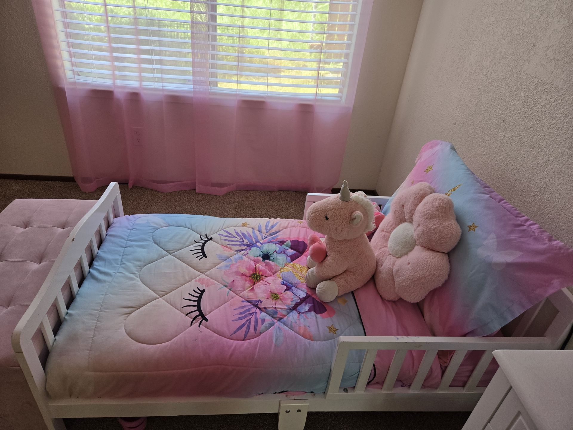 White toddler bed Includes : toddler bed frame , :Mattress (top layer has a cut works with matresss protector ) : unicorn bedding Unicorn stuffy and flower pillow not included