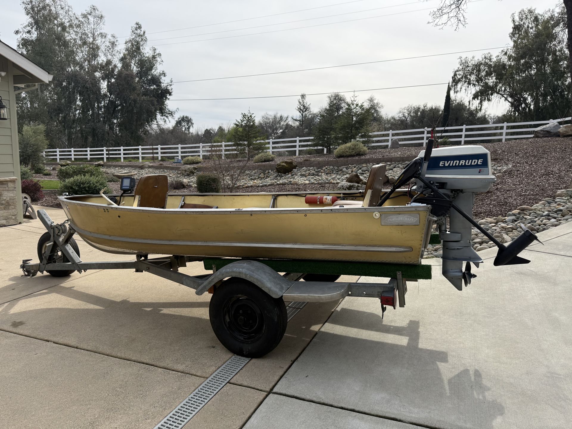 14 ft. Feather Craft Fishing Boat with Push Bottom Start 25 HP Evinrude 2-Stroke Motor and Trailor