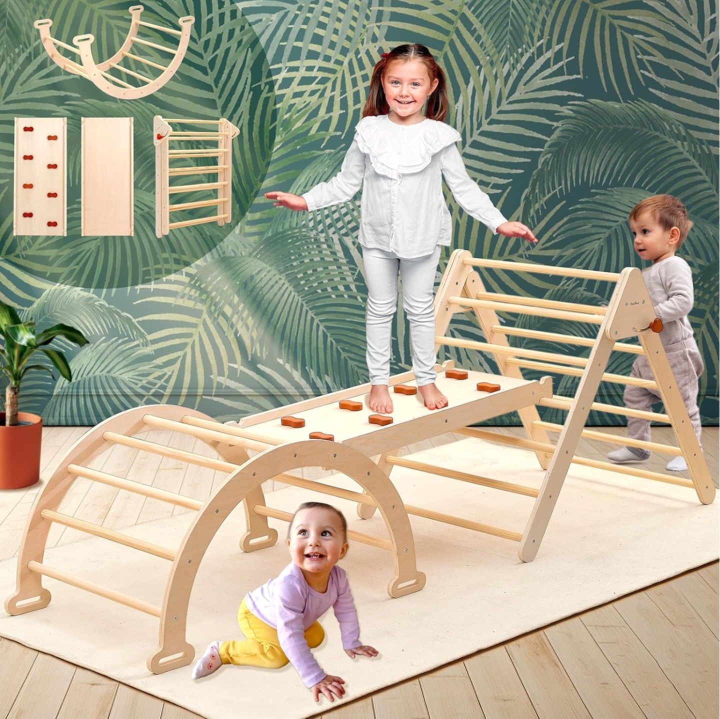 PairPear Foldable Pikler Triangle Climbing Set for Kids, 7 in 1 Montessori Large Wooden Climbing Toy