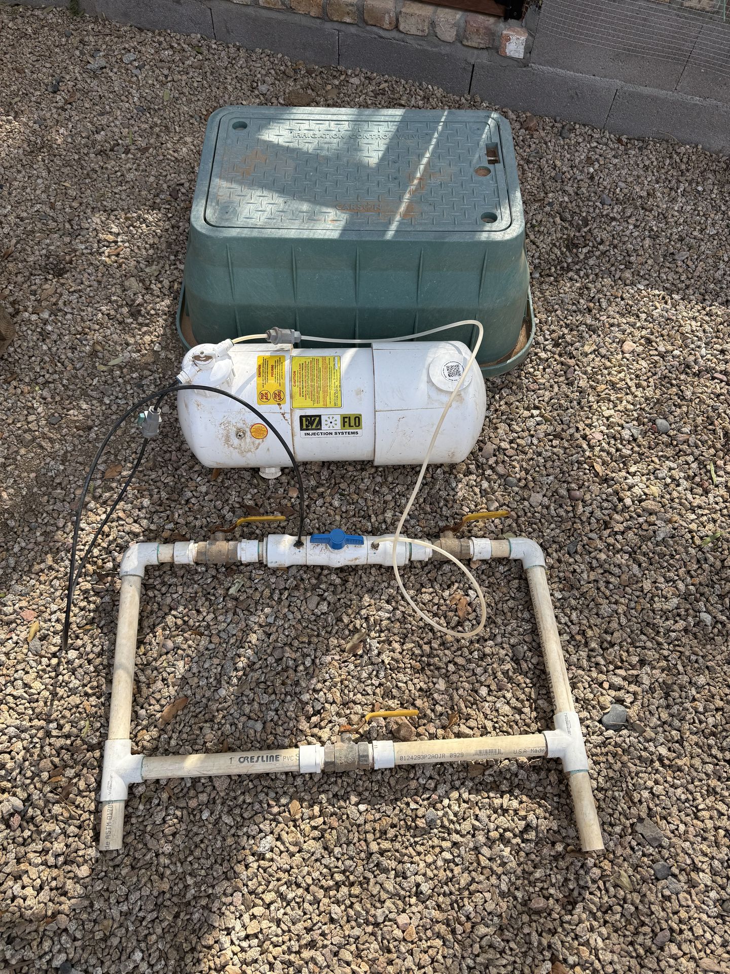 EZ-FLO Main Line Systems attach directly to your in-ground sprinkler and/or drip irrigation system. Every time you use your irrigation system, EZ-FLO releases small, precision doses of water soluble or liquid non-hazardous fertilizers into the water stream on a consistent basis. One system will feed through both sprinkler and drip irrigation zones without the need to make any adjustments or nozzle changes to compensate for water flow or water pressure. Large valve box also included and it’s already plumped for 1” main line but can be reduced to smaller main line or increased for larger main line. Used for only about 10 months. Still in great shape. Can meet up on Ellsworth and Brown. Speak English and Spanish. $500 obo