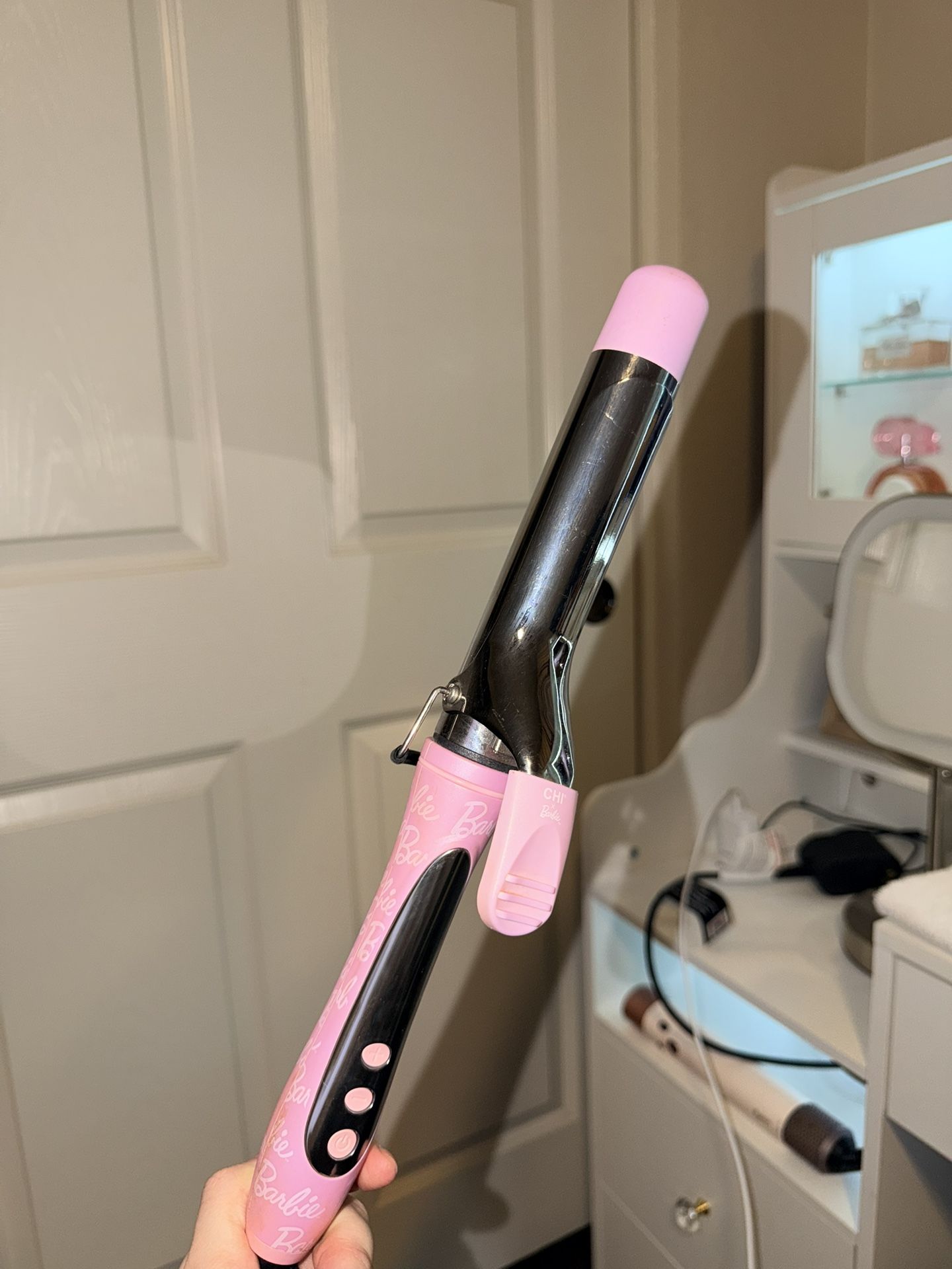 The cutest most iconic limited edition Barbie curling iron! So cute it has so many cute Barbie details. Works amazing, the brand is chi I’ve only used it sparingly because I don’t curl my hair much. Such a cute collectors item for any girl or woman who loves Barbie.