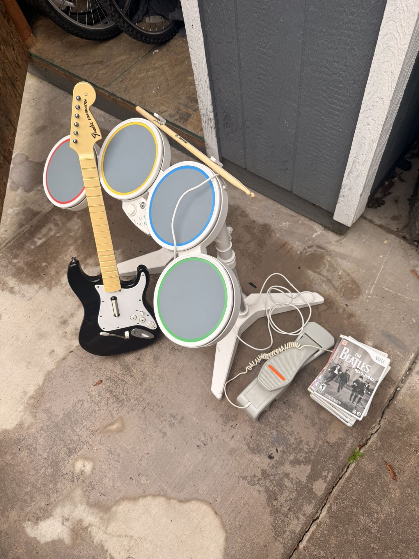 Rock band guitar and drum set. Comes with The Beatles rock band game, pedal and sticks. $185
