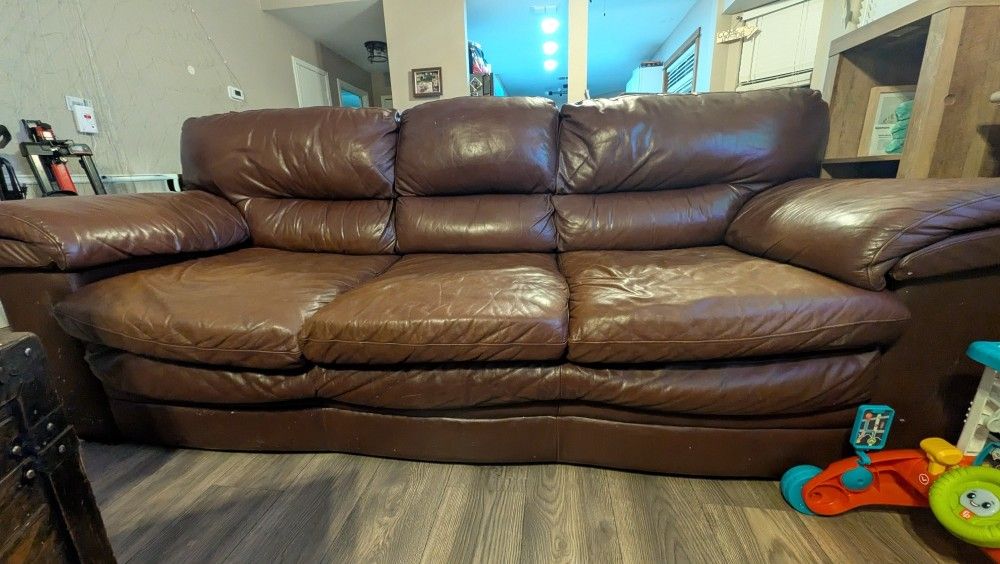 If this is still posted, it is still available unless noted in listing. 1 Large (heavy) Sofa 1 Large (heavy) Sofa Chair 1 Large Ottoman Dimensions: Sofa- L 93" x W 38" x H 38" Sofa Chair- L 47" x W 41" x H 38" Ottoman- L 40" x W 32" x H 20" All have wooden feet and frames. PICK UP ONLY First come first serve. NO HOLDS Can negotiate price. This set is very sturdy and has been gently loved. There is wear and tear around the back sides and obviously in the bottoms. No rips or tears. We do recommend only using a mild dish soap to clean and we also use leather cleaning wipes.