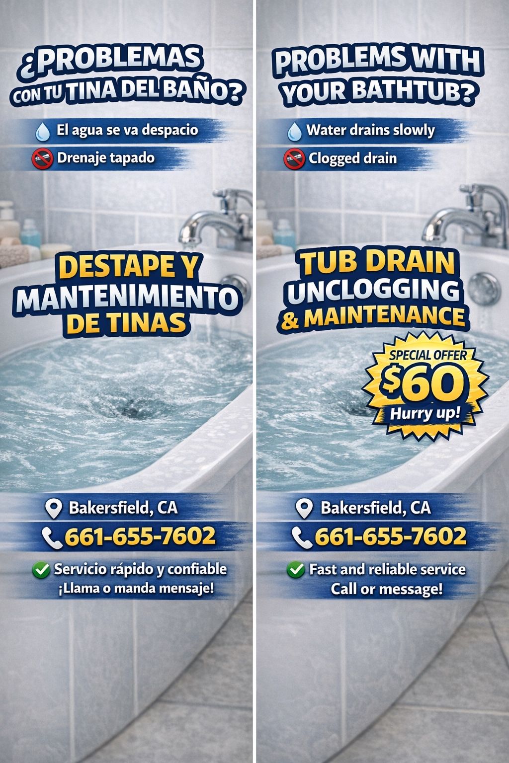 If you have a problem with the water not draining from your bathtub, call me; I can fix it.