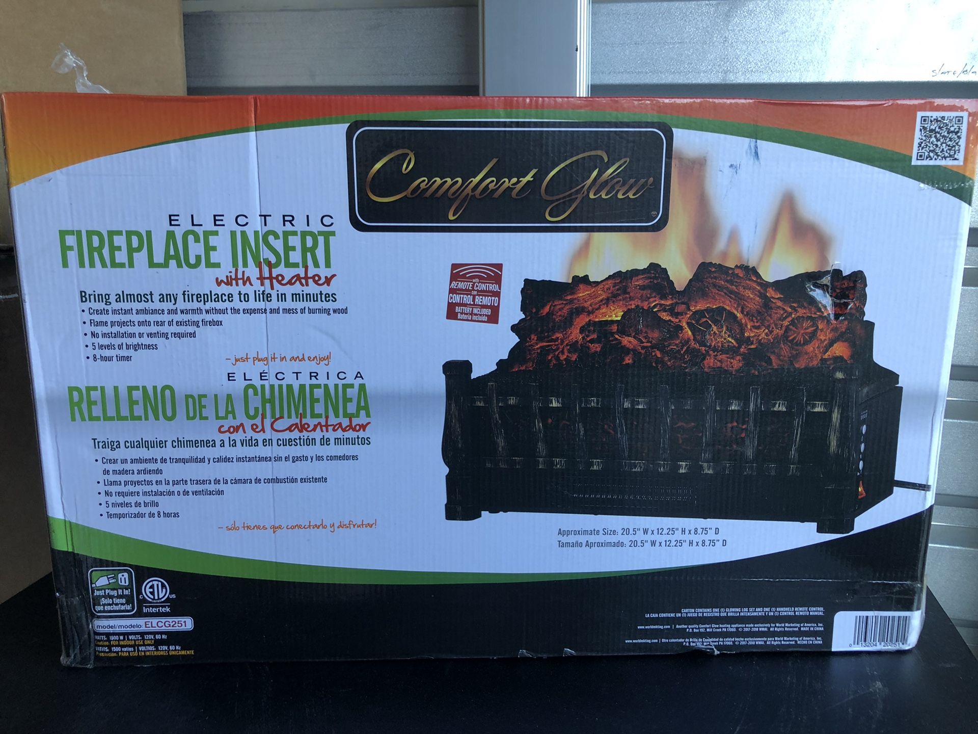 Brand new never opened box Description This Comfort Glow electric log set brings the glow back to your old fireplace. A realistic dancing flame is projected onto the firebox walls. Built in heater produces 4,600 BTU's of fan-forced heat. Included remote control provides optimum convenience. Side mounted controls add realism to this unit. Features & details Heater with circulating blower; remote control Dancing yellow flame effect; flame operates with or without heat 5 brightness levels; energy efficient LED technology Glowing ember bed Fully assembled Product information Item Weight 15.9 Pounds Heating Method fan_&_forced_air Is Assembly Required No Number Of Pieces 5 Batteries Required No Included Components ELCG251^REMOTE
