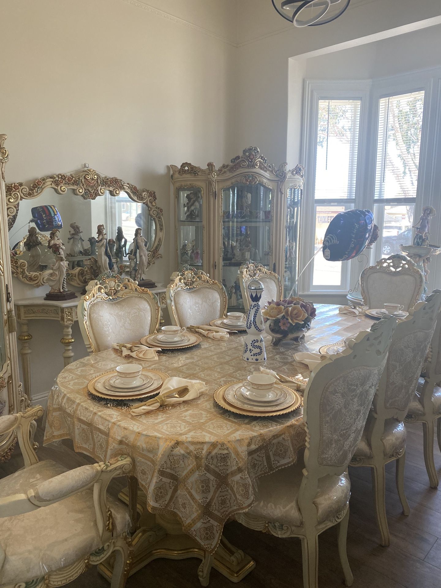 Dining room table with eight chairs To shadowboxes two side tables with Meryls in very good condition high end quality serious buyers only $5500