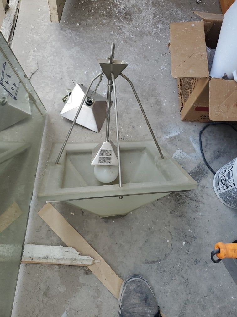 Hanging glass and nickel light. No scratches just dirty. Also have a matching light for bathrooms on my profile. Let me know. Make me an offer.