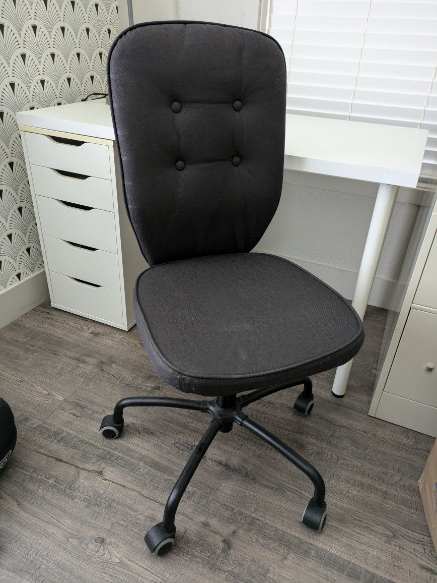 Black IKEA Desk Chair - like new condition Fabric material, cute bows accent on the back, swivels, rolling wheels, adjustable height. Desk and desk lamp listed separately, willing to bundle, make an offer!