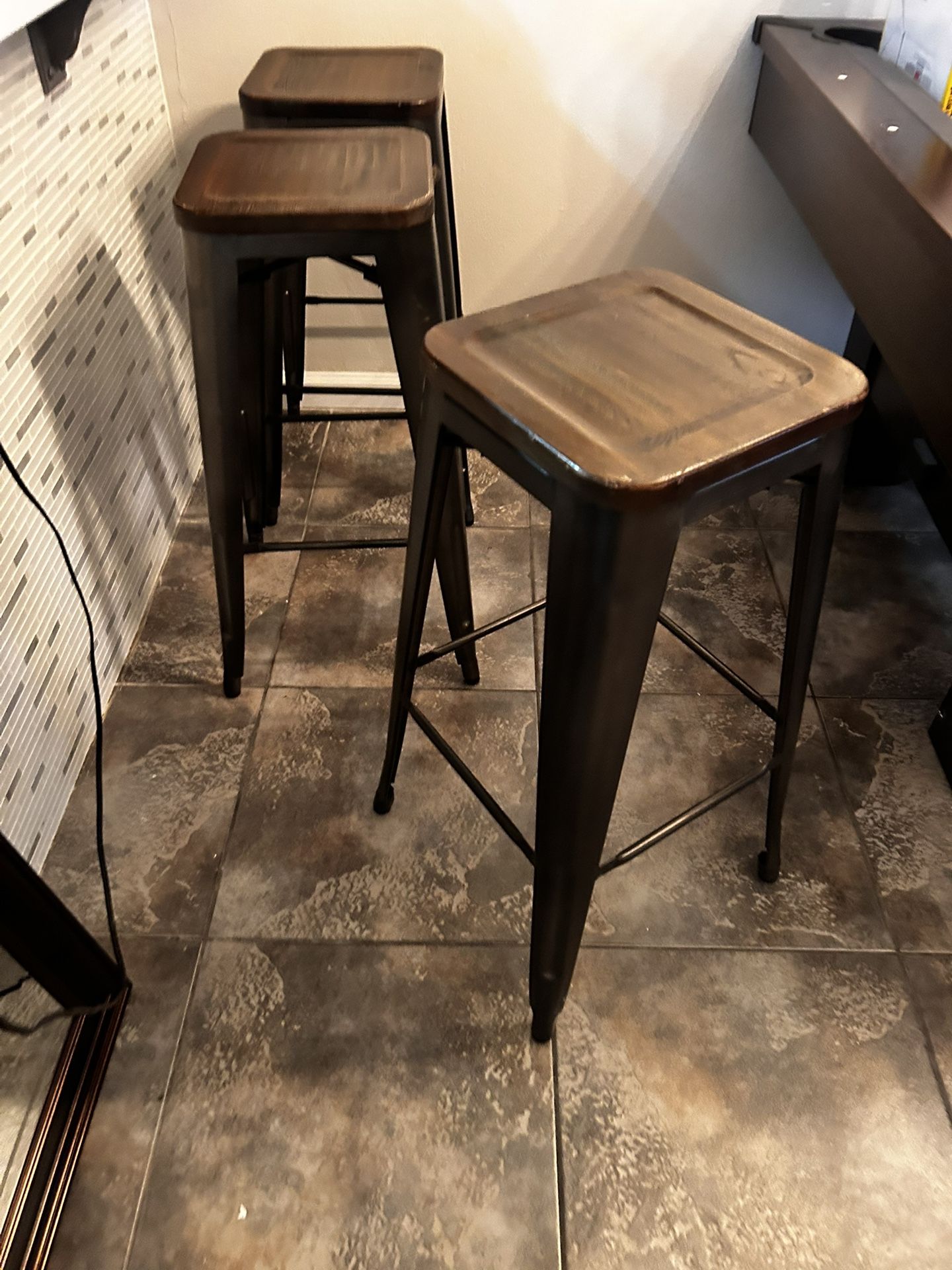 I’m selling a set of three metal bars stools with wooden top, normal use. Standard measurements .