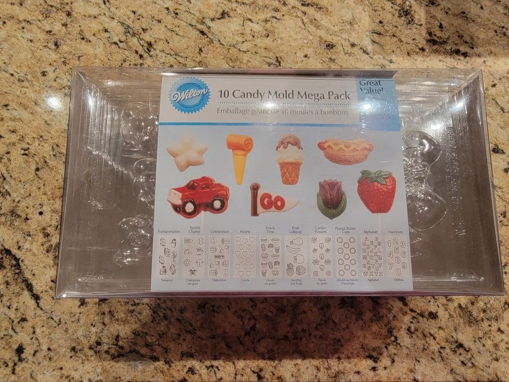 Wilton candy mold set with various shapes. Perfect for creating fun treats. Includes molds for cars, ice cream, and more. Clear plastic material. New and unused.