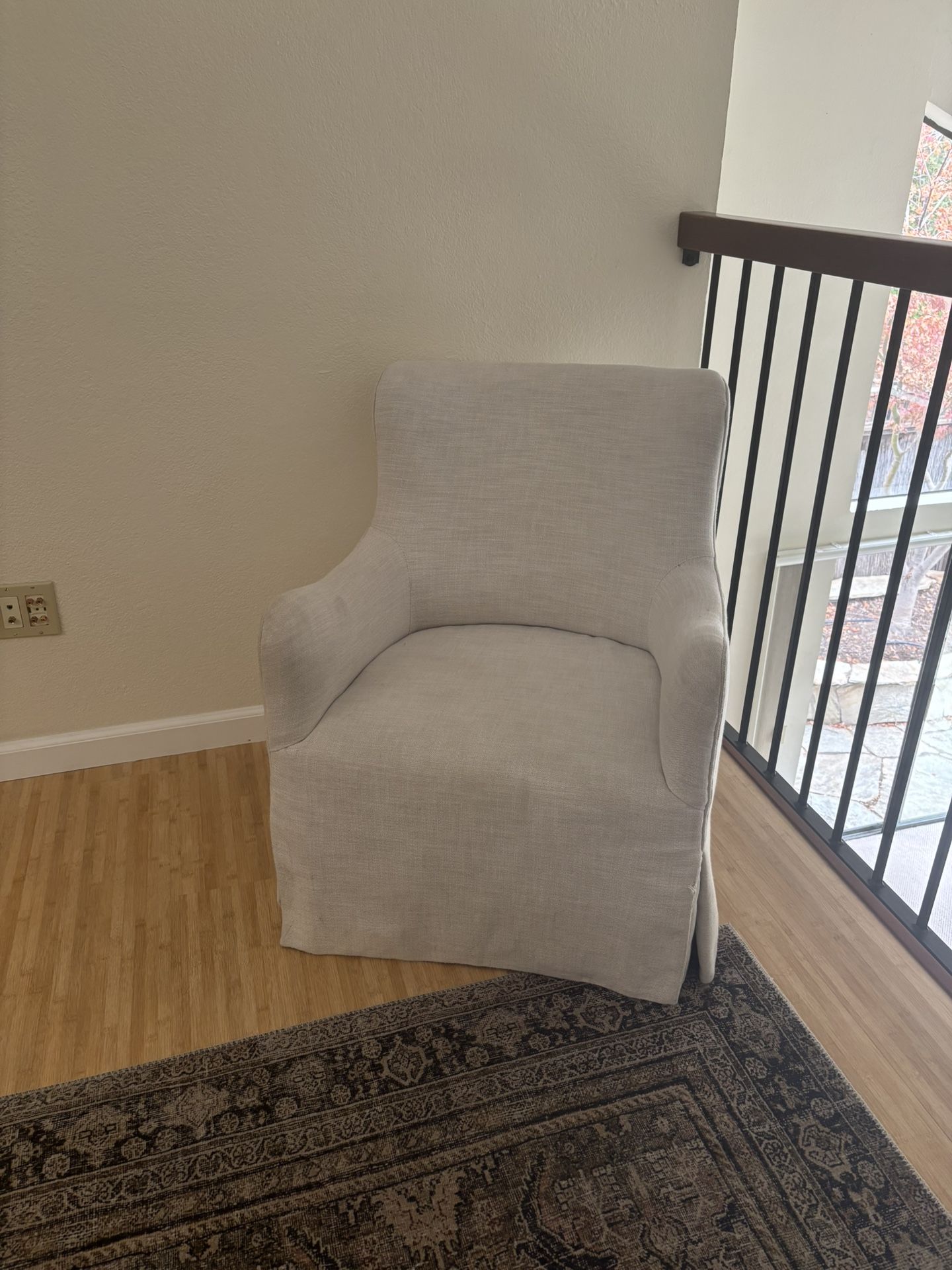 Light tan/oatmeal Serena and Lily chair. Smoke free home but we do have a dog. Slight rip in fabric and base of chair (in photo) but barely noticeable. Would be great in a nursery, bedroom or living room. 24 in x 17 in x 30 in. Pickup only.