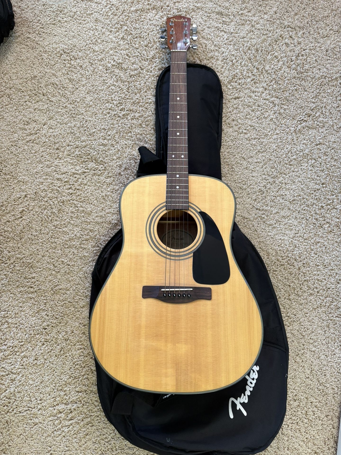 Fender DG-8S NAT with soft case Overview The Fender DG-8S Acoustic Guitar Pack is a full side guitar with a laminated basswood top and body, Nato neck, and rosewood fingerboard and bridge. It has 20 frets and a high gloss finish. The guitar has a mellow sound that is well balanced. $169 new list