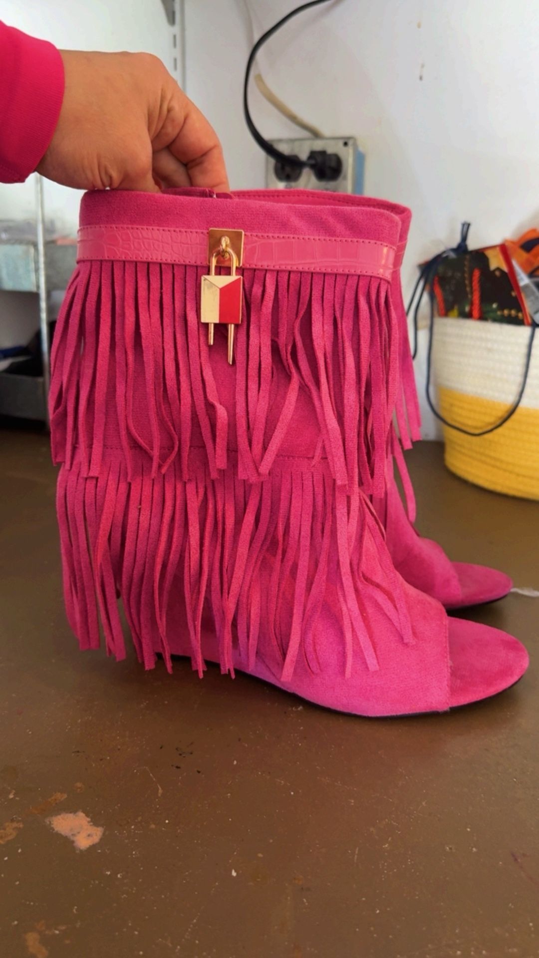 Pink suede fringe boots. Never worn. Fun, bold statement piece. Perfect for festivals, nights out, or styling a standout look.