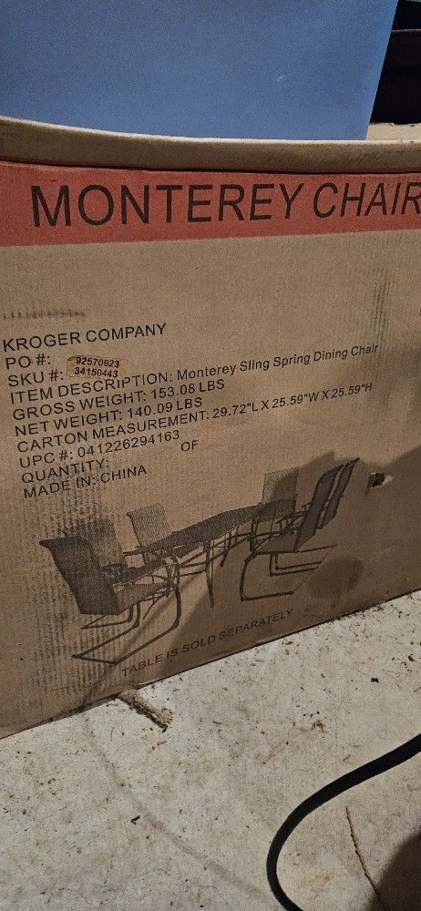 Brand new unopened box of patio chairs ! Sling back. very sturdy and off mocha color and I have 7 still in its original box.. The box of chairs which includes 7 is being listed at $125. Paid over $365. . La Conner pick up