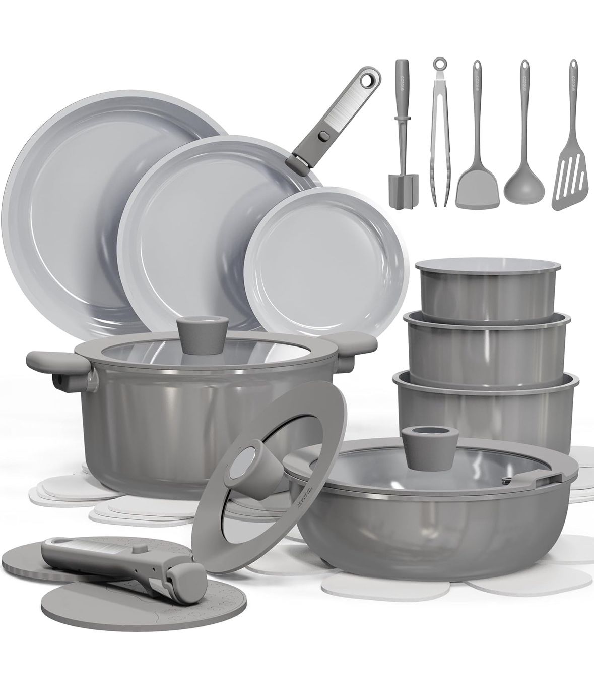 CAROTE 25pcs Ceramic Cookware Set Nonstick, Pots and Pans Set Non Stick, Non Toxic Cookware Detachable Handles, Dishwasher/Oven Safe, RV/Camping Cookw