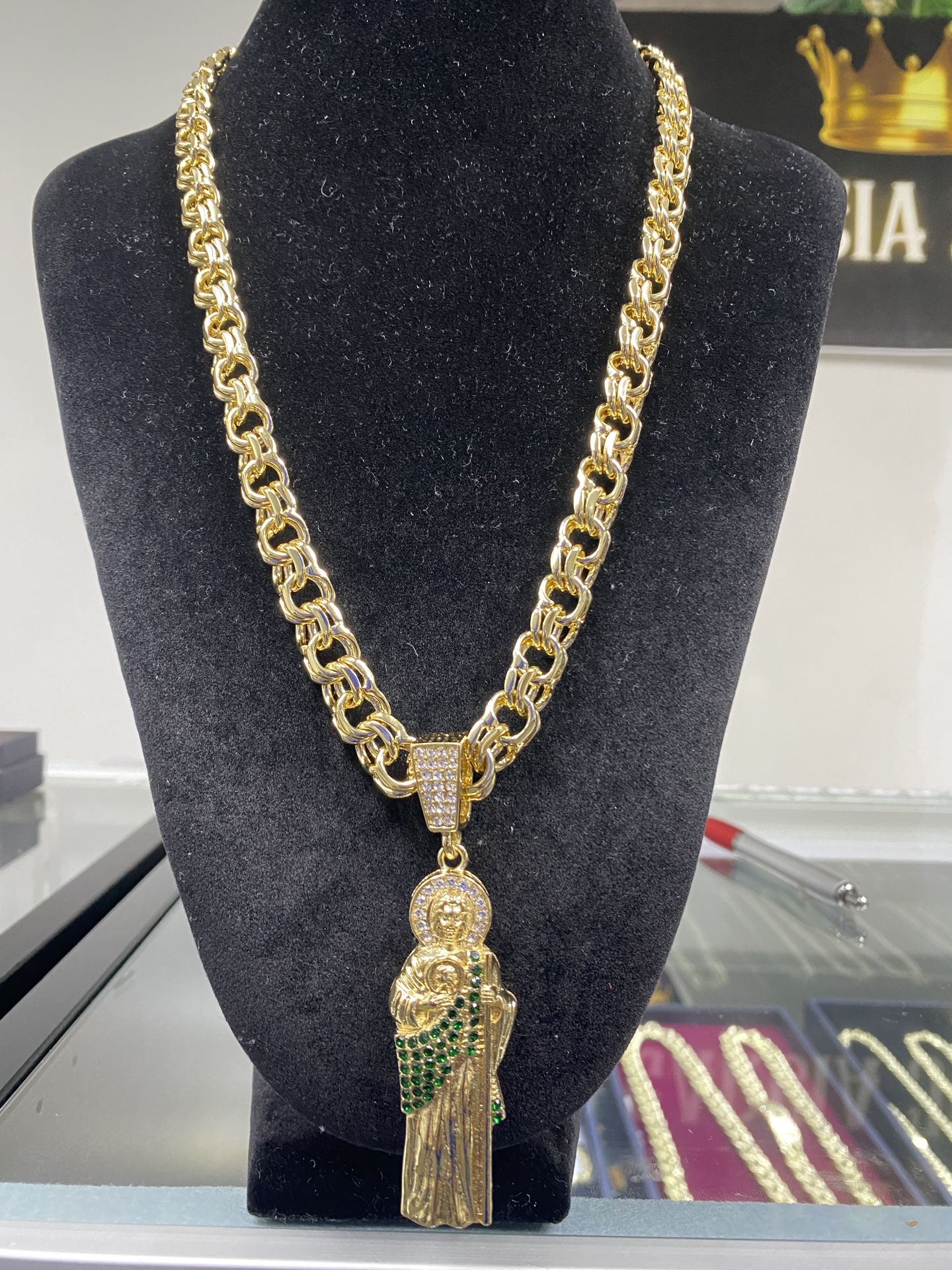 The chain is 12mm thick & 26” long the charm is 3.5” both are gold filled very high quality jewelry
