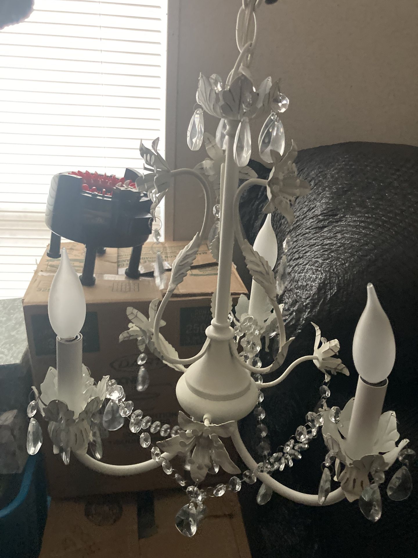 White metal frame with floral design Hanging crystal-style drops and bead strands three candle-style light sockets Great for shabby chic, cottagecore, or vintage décor lovers Great condition—just needs installation Cash or cash app Available for pickup or delivery at an extra charge . Message if you’d like measurements or additional photos!
