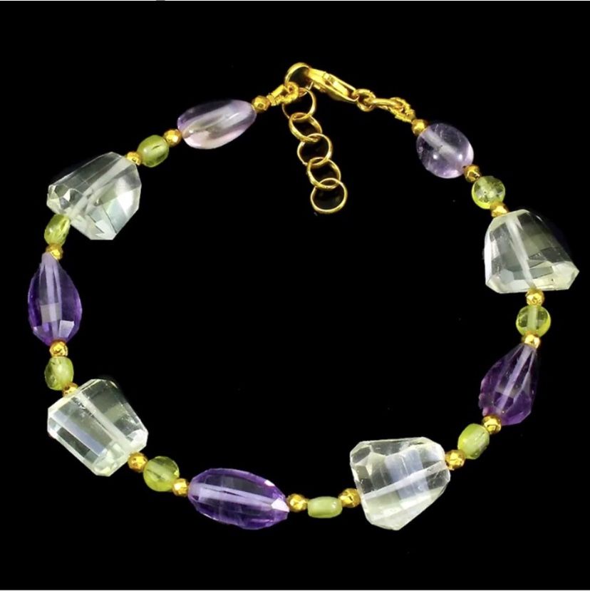This Beautiful Fancy Cut Brazilian Natural Top Nice Green Amethyst, Amethyst & Peridot with Gorgeous Luster and VVS Clarity in a 14kt Yellow Gold plated Solid Sterling Silver Bracelet, stamped 925 stone s a handmade one of a kind design. Size 8” 12x10mm, 4mm stones Total Face 155x10mm