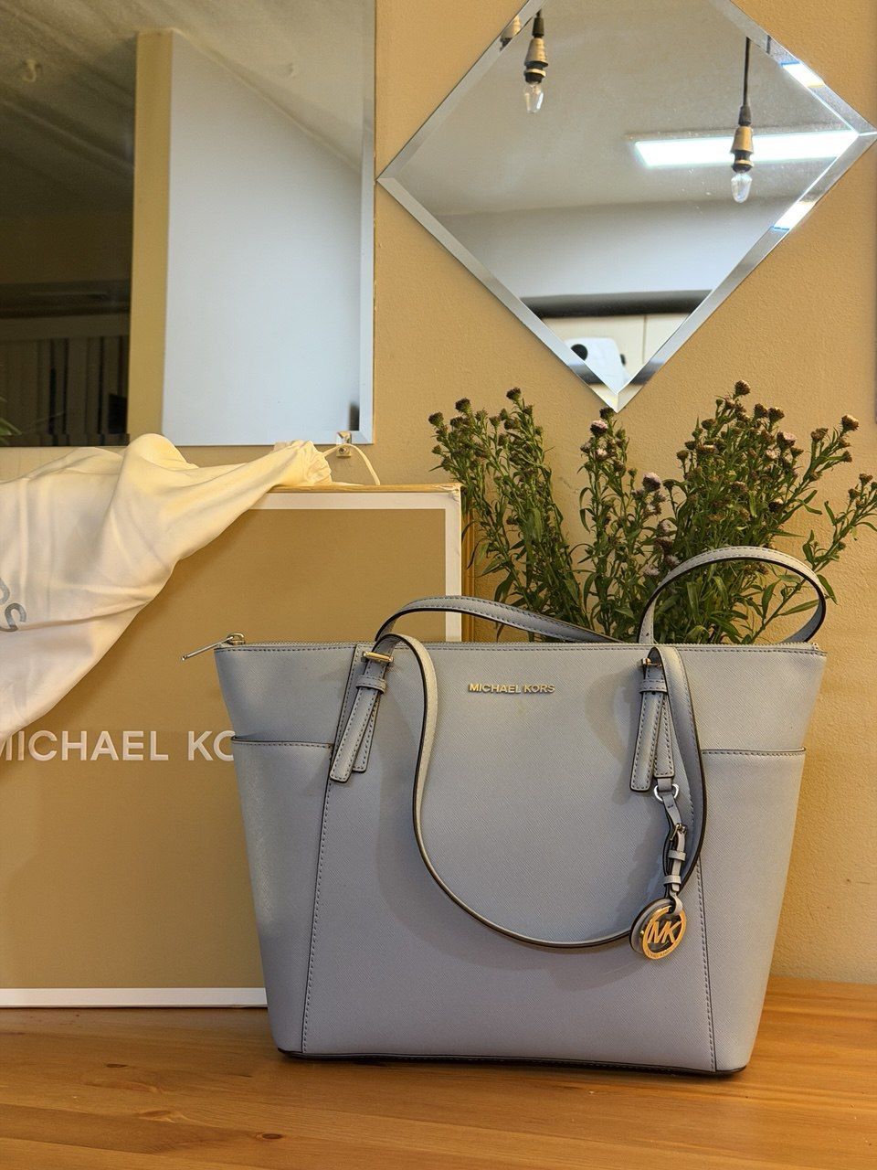About the product This bag is identified as the Michael Kors Jet Set East/West Top-Zip Tote. It also bears a visual resemblance to the Charlotte Large Top-Zip Tote. It is crafted from signature Saffiano leather, known for its durability and scratch resistance. The light blue color is officially called "Pale Blue" or "Vista Blue." The hardware is gold-tone.