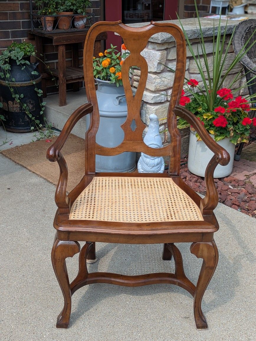 Stunning Baker Furniture Solid Wood French Country Dining Chair; Caned Seat from Baker's Northern Italian Collection. This listing is for a single chair. Beautifully crafted dining chair by luxury furniture brand Baker. Purchased in the 1970s, this chair reflects the company's peak as a maker of high-end, high-style furniture. The brand was especially adept at making historically accurate reproductions, scaled and adapted to modern use. The chair is structurally perfect - no loose joints, no wiggle, no tentativeness to any of the parts. There are some dings here and there and minor scratches. Minor discoloration. Little to no wear on the cane. No smoking, no pet home. On the right arm there is a slim minor crack. Please view all photos as they are part of the description. Dimensions Armchairs: 40” tall. The widest point on the back is 16”. The outside/front of the arms are 23” wide. The seats are 16” wide at the back, 22” wide at the front, 17.5” deep and 17.5” high. The armchairs are appx. 22” deep from front to back. The arm height is 27". We are in Crystal lake if you are interested. Please message with inquiries. We are open to offers on most items. If you click on my name you can see my other listings and follow for more. There is a cushion included that could be reupholstered. Cash only Thanks