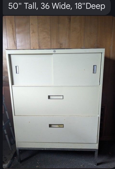 Sturdy metal filing cabinet with two drawers and a sliding door compartment. 36 x 18 x 50 tall. No key. Delivery is available for a minimum of $25.