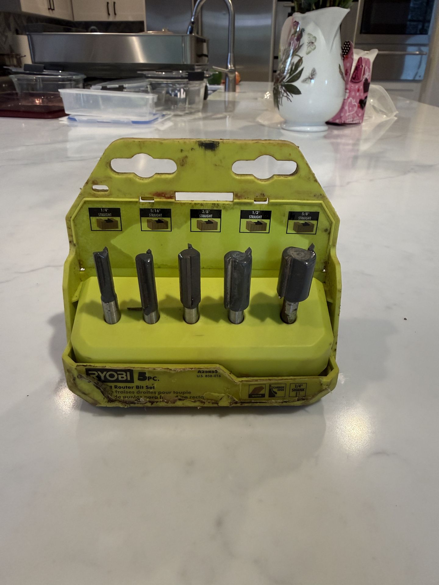 Ryobi straight router bit set, five piece. My brother owes me money and gave me his tools to sell. Perfect condition. Includes; 1/4 inch, 3/8 inch, 1/2 inch, 5/8 inch, 5/16 inch. Designed to fit a 1/4 inch collet. Carbine blade edge edges for increased your ability. Model #A25RS51.