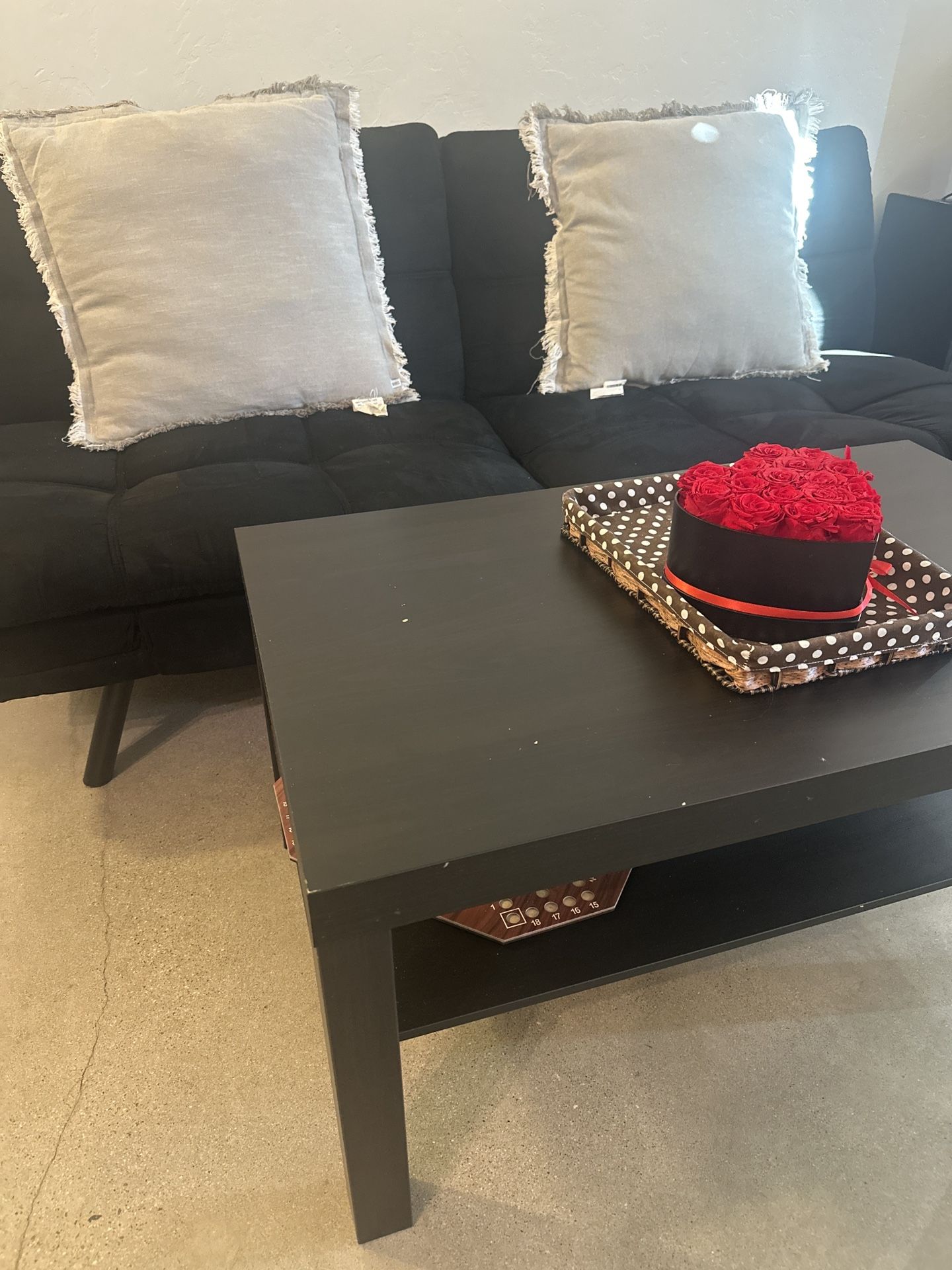 Selling a black sofa bed and coffee table due to moving out. The sofa easily converts into a bed and is comfortable and sturdy. Both items are in good condition. Items included: • Black sofa bed (converts into a bed) • Coffee table with lower storage shelf ✔ Clean and well maintained ✔ Smoke-free home ✔ Great for apartments or guests Pickup only
