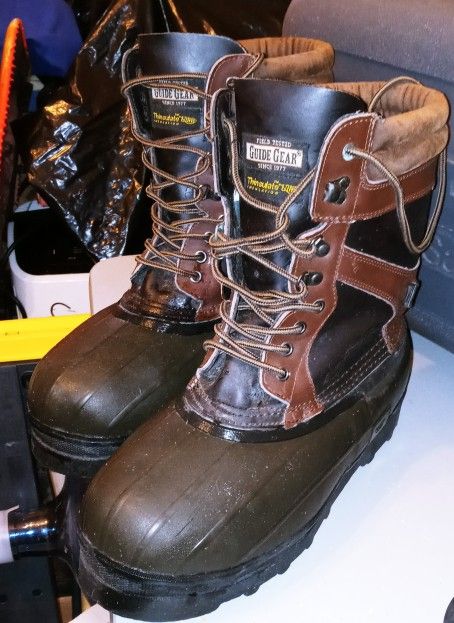 Guide Gear Boots $35.00 GUIDE GEAR Boots Brown Pac Men's Size ,9 wide Hunting Boots Thinsulate -120F Rated GUIDE GEAR Boots Brown Pac Men's Size 9 wide. This is one heck of a pair of boots, they are super heavy duty pair of boots. Steel Shank in soles Thinsulate Ultra Felt Liner Pacs - Rated at minus -120F. Guide Gear - 600G - Thinsulate - Lace-up - Winter Boots - Size 9, wide – Cold weather Hunting, sitting, working, or walking. No damage, very lightly worn if at all. Brown Thinsulate Ultra Leather Rubber Lace Up Boots Removeable Insert padded insulated Liners. Boots are very heavy, warm, and have thick inserts and soles. Have room at the toes for hot hands heat packs.