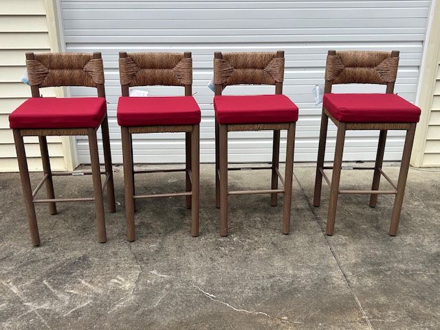 Brand New, Firm, Set of 4, Safavieh Couture Romona Outdoor Rattan Barstools Brand New, PICKUP ONLY IN LACEYS SPRING Product Information: These are home furnishings made with quality, craftsmanship, and style. They are part of the Safavieh Couture Collection The color/finish is brown; powder coating finish. These stools will elevate your outdoor gatherings with the ROMONA rattan weaving outdoor barstool in sleek brown. This stylish piece combines the natural texture of rattan weaving with sturdy metal construction to create a unique seating option for your patio or garden. Designed with comfort and elegance in mind, the barstool's ergonomic shape provides great support while its contemporary black finish adds a touch of sophistication to any outdoor setting. Perfect for casual drinks or weekend brunches, the ROMONA barstool seamlessly merges functionality with style. Its lightweight design makes it easy to rearrange for any occasion, and its durable materials ensure that this barstool remains an inviting feature of your outdoor space. Whether you are entertaining friends around the pool or enjoying a quiet evening under the stars, the ROMONA rattan weaving outdoor barstool offers the perfect blend of form and function to make any moment enjoyable. Thern as an added feature I have added red bottom cushions to help you enjoy your bar stool experience. This set is currently being sold as a set of 2 for $599.99 and a set of 4 for $1,999.98. Features: Brand: Safavieh Couture Color Brown Additions: 4 Beautiful red Bottom Cushions Measurements: 17.7in x 19.7in x 43.3in Seat dimensions: 17.7in x 17.5in x 29.5in Back of chair measures 13.3in Nintey Percent Metal, Ten Percent Rattan Store outdoor furniture indoors or cover well when not in use. Remove wooden furniture from standing water. Dust regularly with small brush or vacuum. Spills should be taken care of immediately before they harden or stain with a slightly dampened sponge. Do not use bleach solutions. Suitable for indoor/outdoor use. Imported