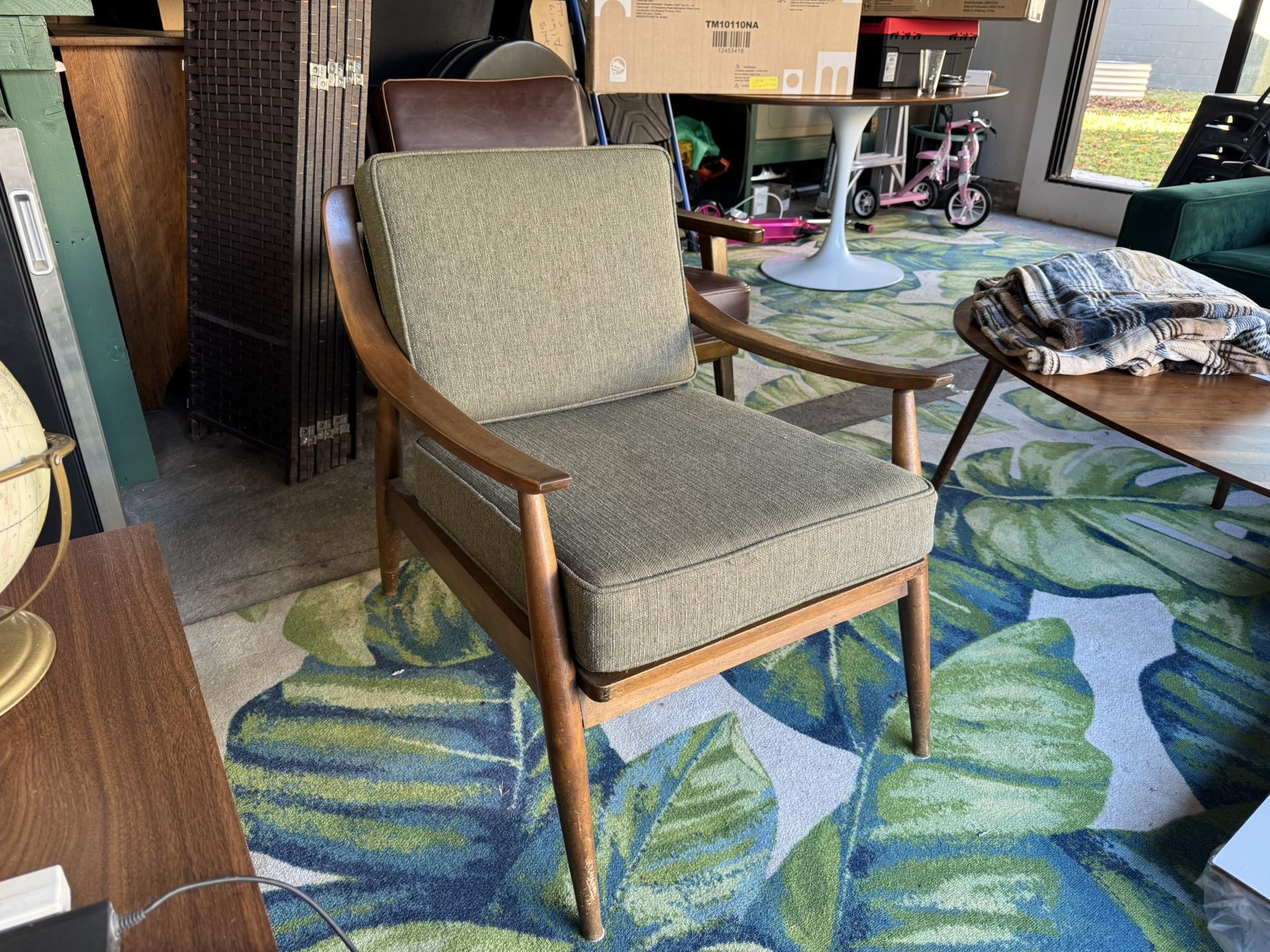 Mid-Century Modern Lounge Chair – Tell City Chair Co. Vintage mid-century modern lounge chair by Tell City Chair Company. Solid wood frame with sculpted arms and tapered legs. Green upholstery was reupholstered about 7 years ago and shows light wear. Chair is sturdy and comfortable. Wood has minor, age-appropriate wear. Original maker label present. Great as an accent chair for a living room, office, or reading nook. Details: • Single chair • Solid wood frame • Green upholstery (reupholstered ~7 years ago) • Light wear • Tell City Chair Company Local pickup only. Message if interested.