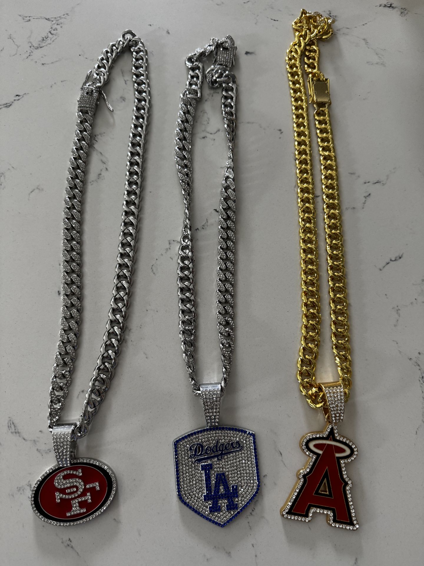Selling team chains with pendants. All in great condition and ready to wear. Solid look with shiny finish and detailed team logos. Each chain is $20. Perfect for game day, gifts, Pickup: Local pickup available. Payment: Cash preferred (Zelle/Venmo also accepted).