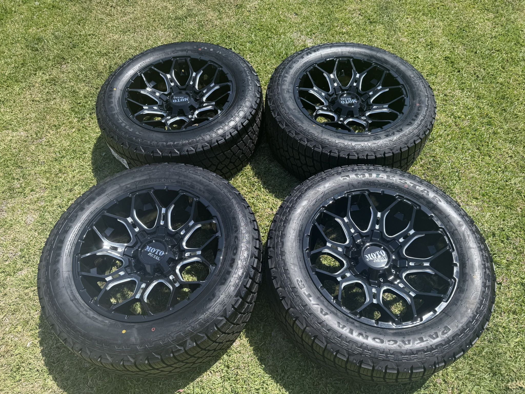 (4) 20” Moto Metal Wheels 33x12.50R20 Patagonia Tires