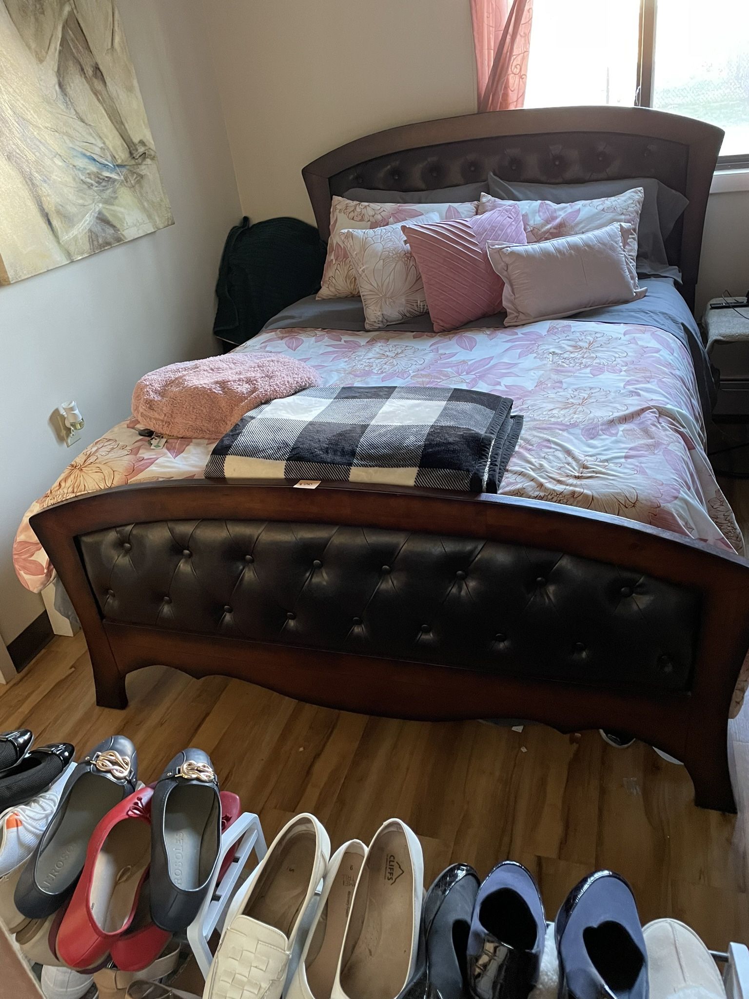 Queen headboard and footboard, queen, boxspring, dresser with mirror, tall chest