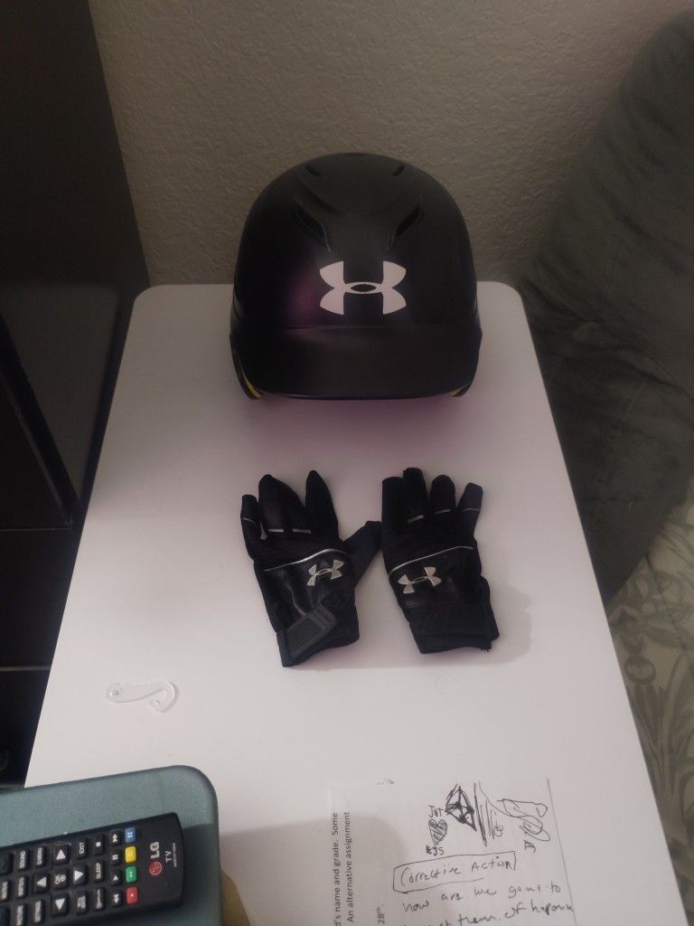 Under armour baseball helmet and youth batting gloves, helmet size 5 7/8 - 6 3/4, very good condition berly used .