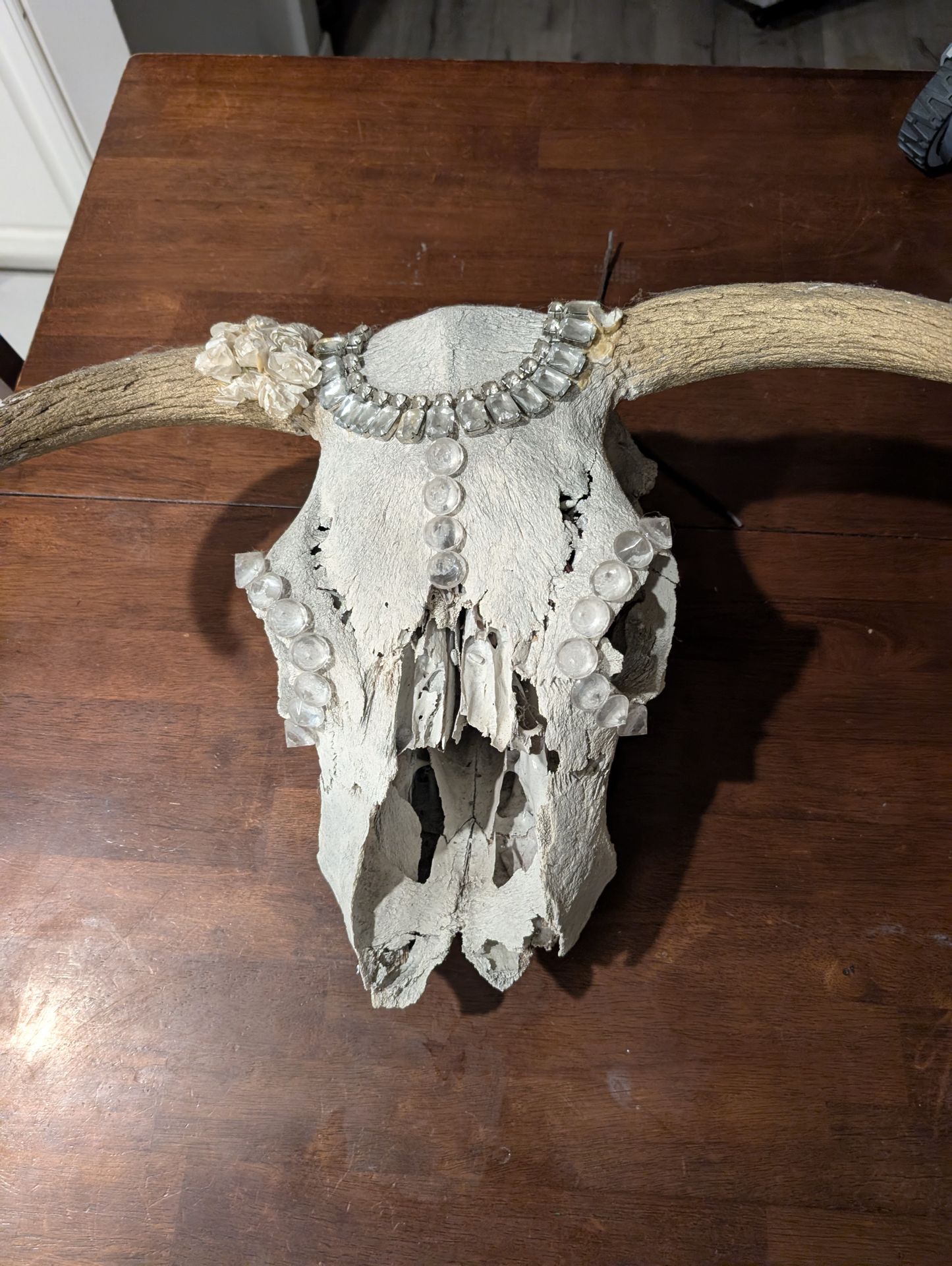 I have a steer or bull skull with his horns. Yes it's real. I could not tell you his age, he's old. Great condition.